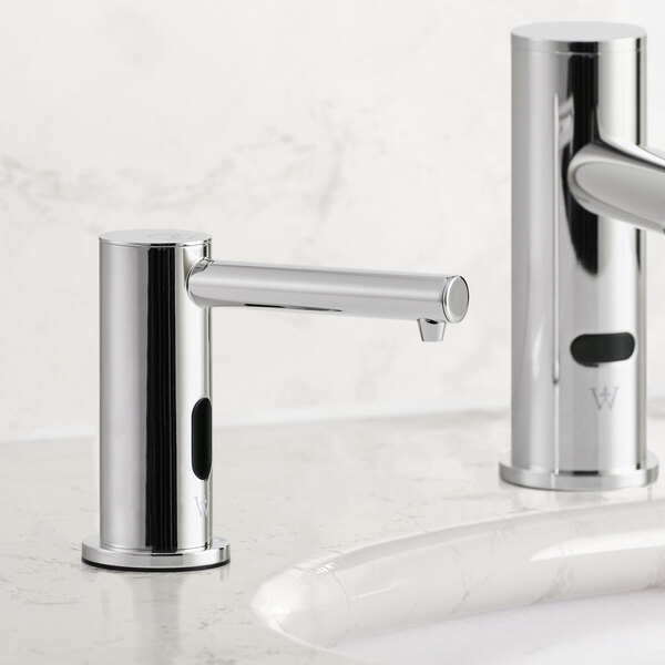 Enhance the cleanliness and efficiency of your commercial restroom with the Waterloo automatic deck-mounted chrome soap dispenser with foam spout. Crafted with durable brass shank construction, this soap dispenser is built to withstand frequent use in high-traffic environments. The hands-free automatic design promotes hygiene by minimizing contact with the dispenser, reducing the spread of germs. Its sleek chrome finish adds a modern touch to any restroom decor, while the included AC adapter, control module, and refill bottle make installation and maintenance a breeze.