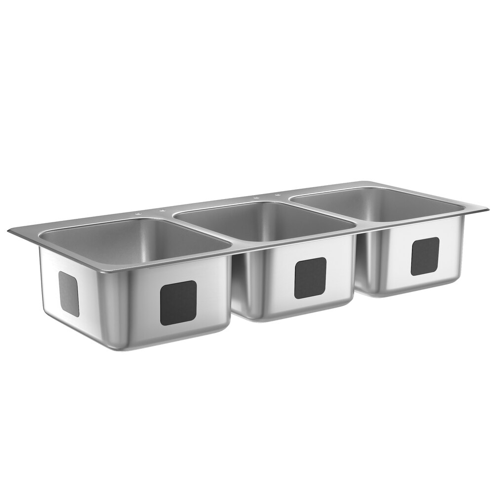 The three 20" x 16" x 12" sinks provide ample work space for a variety of kitchen tasks. Three staff members can comfortably work simultaneously on different duties like food prep and dishwashing. This sink also features a drop-in design that fits down through the top of your counter.